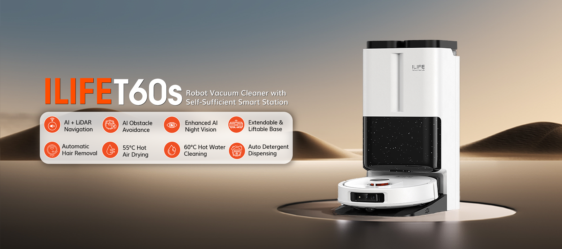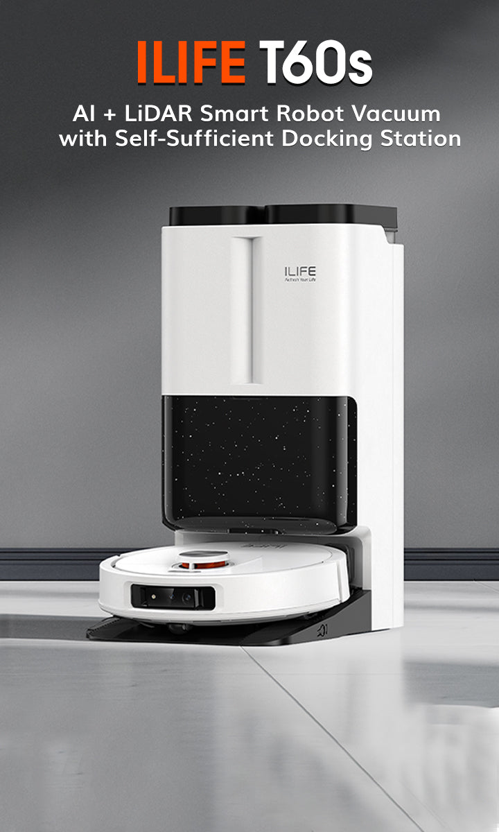 ILIFE T60s Robotic Vacuum Cleaner is a smart, all-in-one cleaning solution powered by AI and LiDAR for precise navigation. This vacuum and mop combo features strong suction, auto mop lift, and a self-emptying dustbin for hands-free cleaning. With self-washing, hot air drying, and a smart mopping system that mimics human movements, it ensures deep, efficient cleaning. Its extendable, liftable mop reaches tight and elevated areas, making it a truly self-sufficient, low-maintenance device
