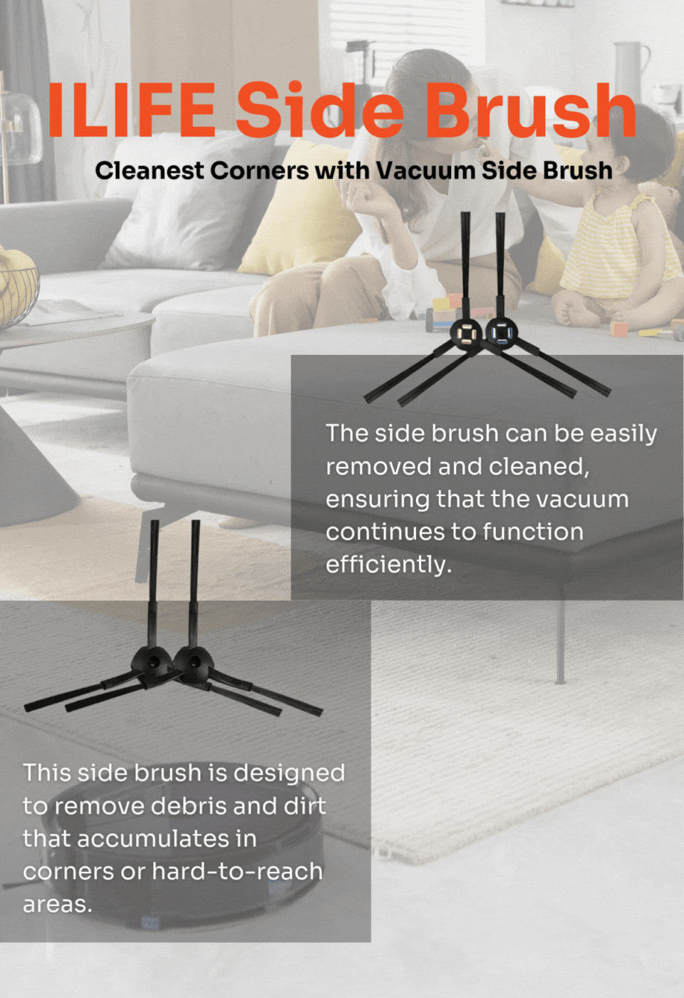 ILIFE side brushes are small, rotating brushes designed to clean the edges and corners of floors and carpets.