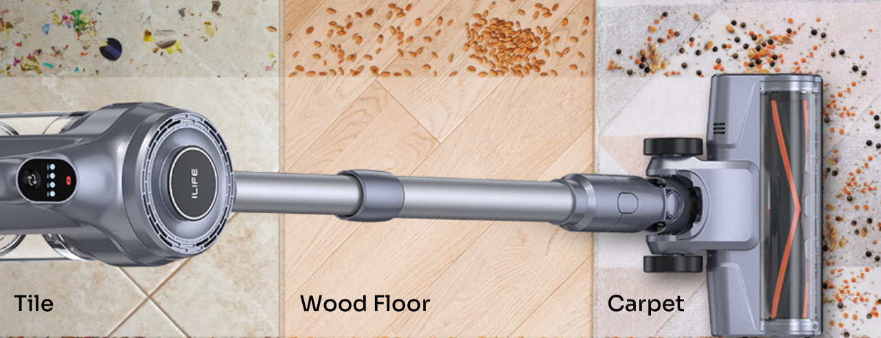 The ILIFE H80 cordless vacuum cleaner takes cleaning convenience to a whole new level with its smart design and surprising flexibility. Say goodbye to struggling with dirt, debris, and pet hair! The H80 boasts a powerful 22,000Pa suction that tackles any mess, on any floor – from tile to plush carpets. The self-adjusting brush head conforms to different surfaces, ensuring a spotless clean every time. And because it's lightweight and portable, you can maneuver around furniture with ease For those hard-to-reach areas, the H80 transforms into a handheld vacuum in seconds, making cleaning corners, furniture, and even your car a breeze.