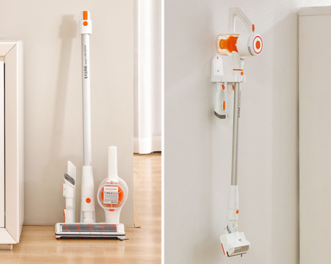 The storage base organizes vacuum accessories like crevice tool, carpet brush, and extension wand, preventing misplacement or damage. It features hooks and compartments, and a wall mounting stand for a clutter-free look.