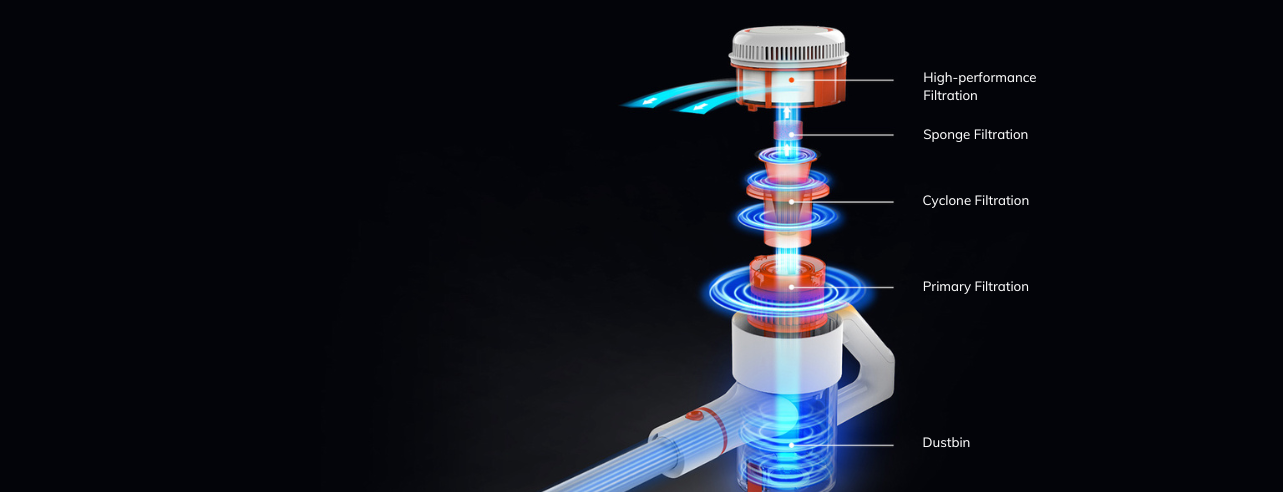 The advanced filtration system isolates and captures different size particles of dust and debris in each stage, improving the filtration efficiency and expelling fresh air.