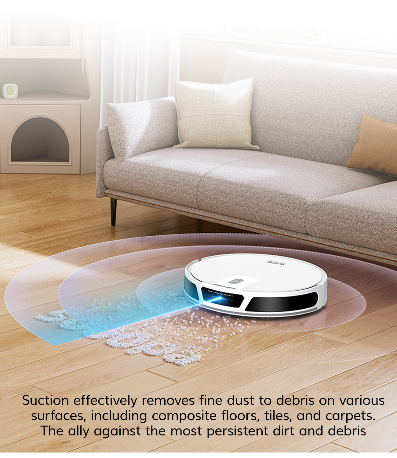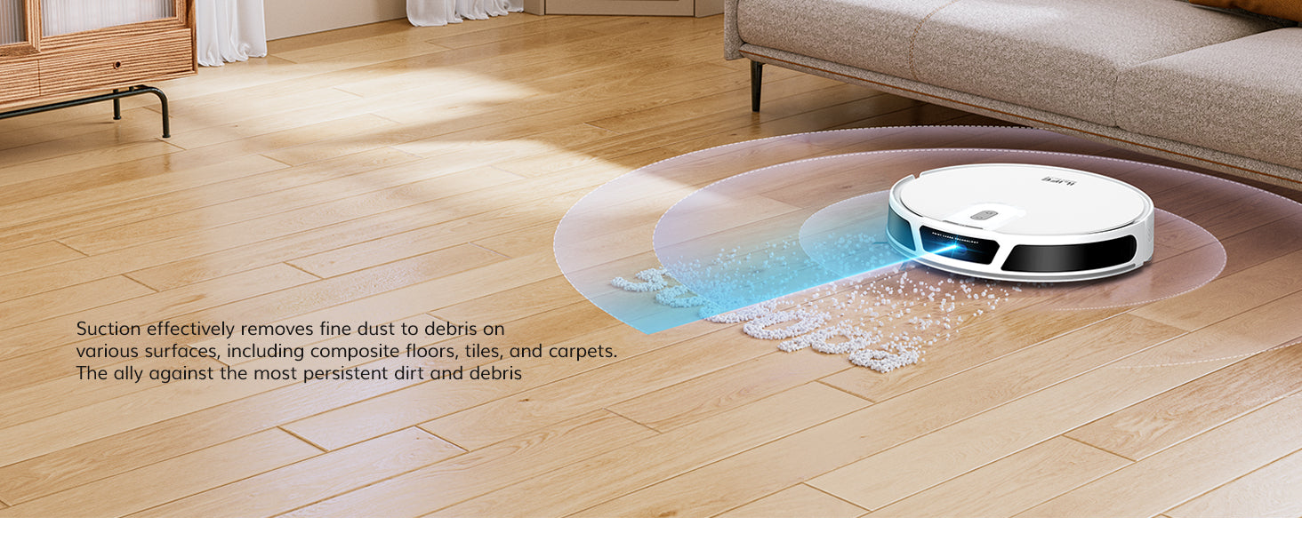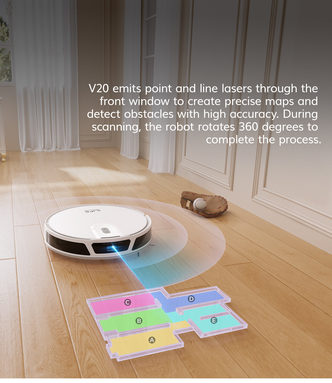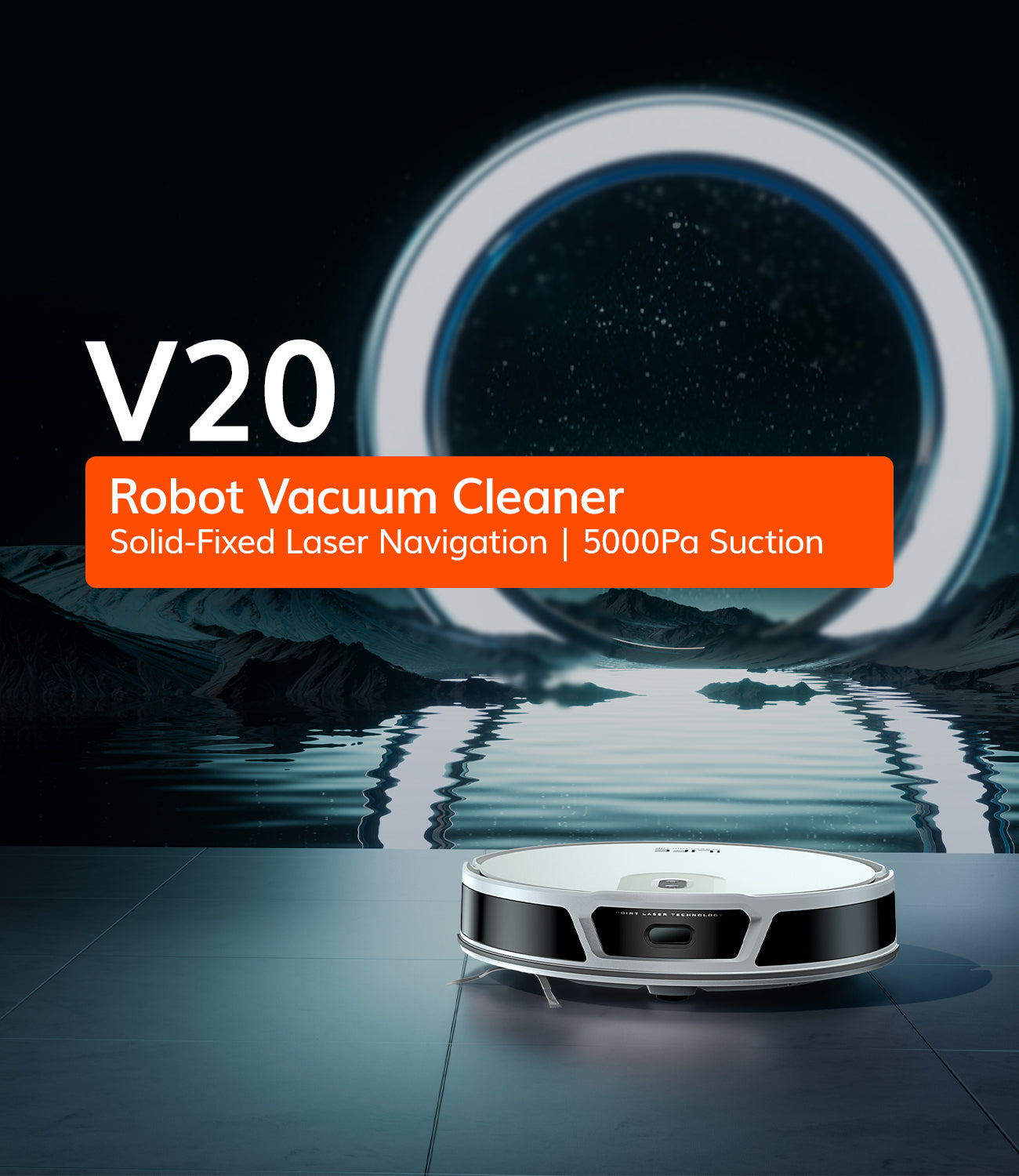 V20 Robot Vacuum features 5000Pa suction, 2-in-1 vacuuming and mopping, and smart SoF Laser Navigation. Control it via app, voice assistant, or remote. With no-go zones, auto carpet boost, and smart mapping, it ensures powerful, customized cleaning on all floor types. The perfect vacuum cleaner for effortless home cleaning