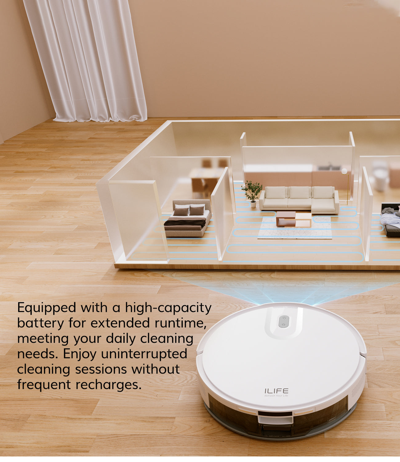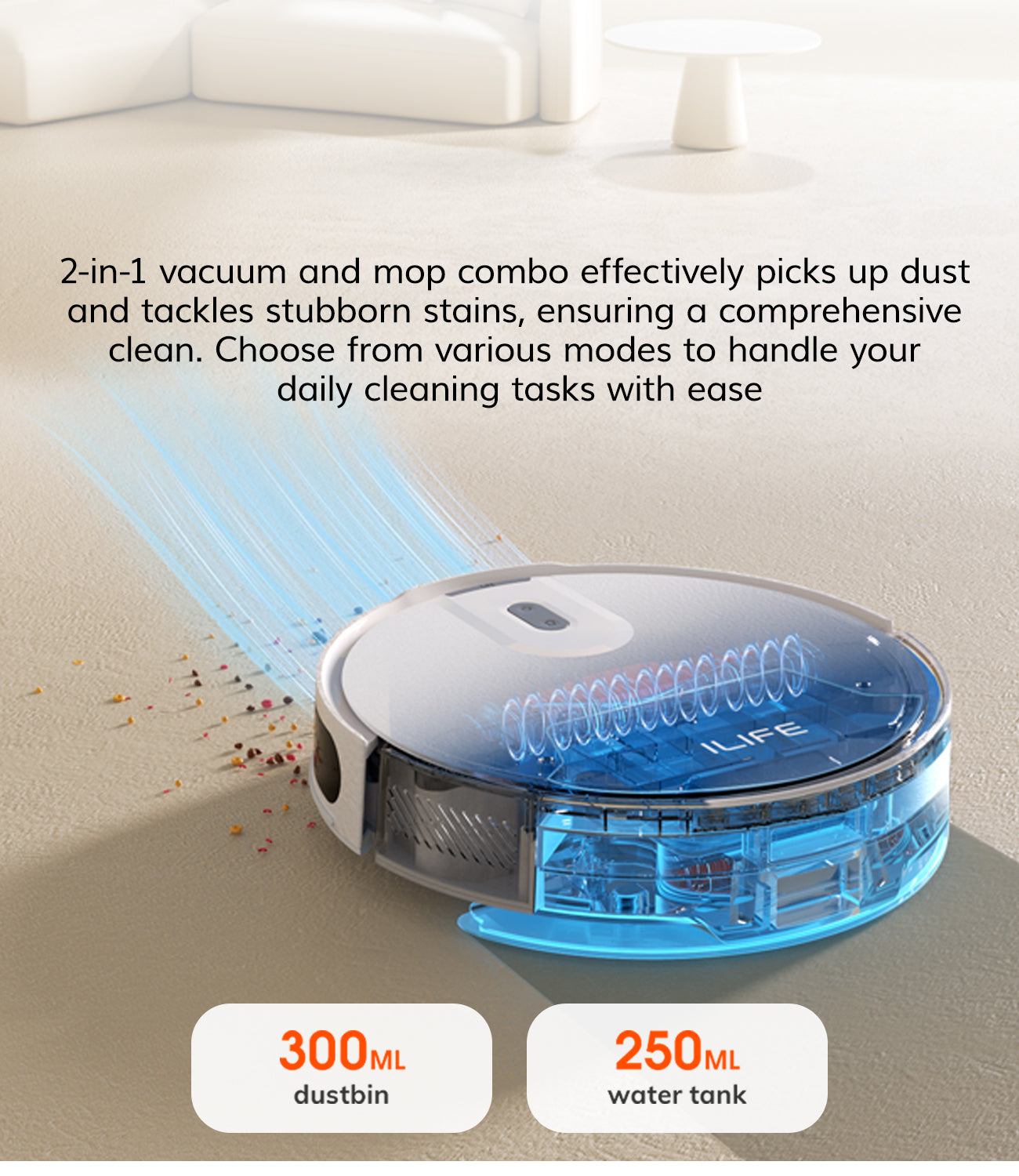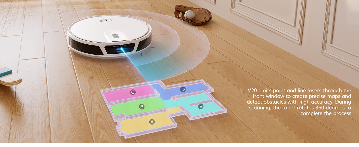 ILIFE V20 robotic vacuum is a versatile and efficient cleaning solution featuring advanced SoF Laser Navigation for precise mapping and thorough cleaning across multiple levels. With a powerful 5000 Pa suction, it easily cleans all types of flooring and includes an auto-carpet boost for deeper cleaning on carpets. Plus, its 2-in-1 vacuum and mop functionality allows it to clean and mop simultaneously, saving time and effort. Additionally, this V20 is controlled via a Smart App, voice assistants, or a remote, offering customisable cleaning schedules, no-go zones, and spot cleaning. With a long-lasting battery, anti-collision sensors, and a slim design for hard-to-reach areas, the V20 provides a safe, efficient, and comprehensive cleaning experience for any home.