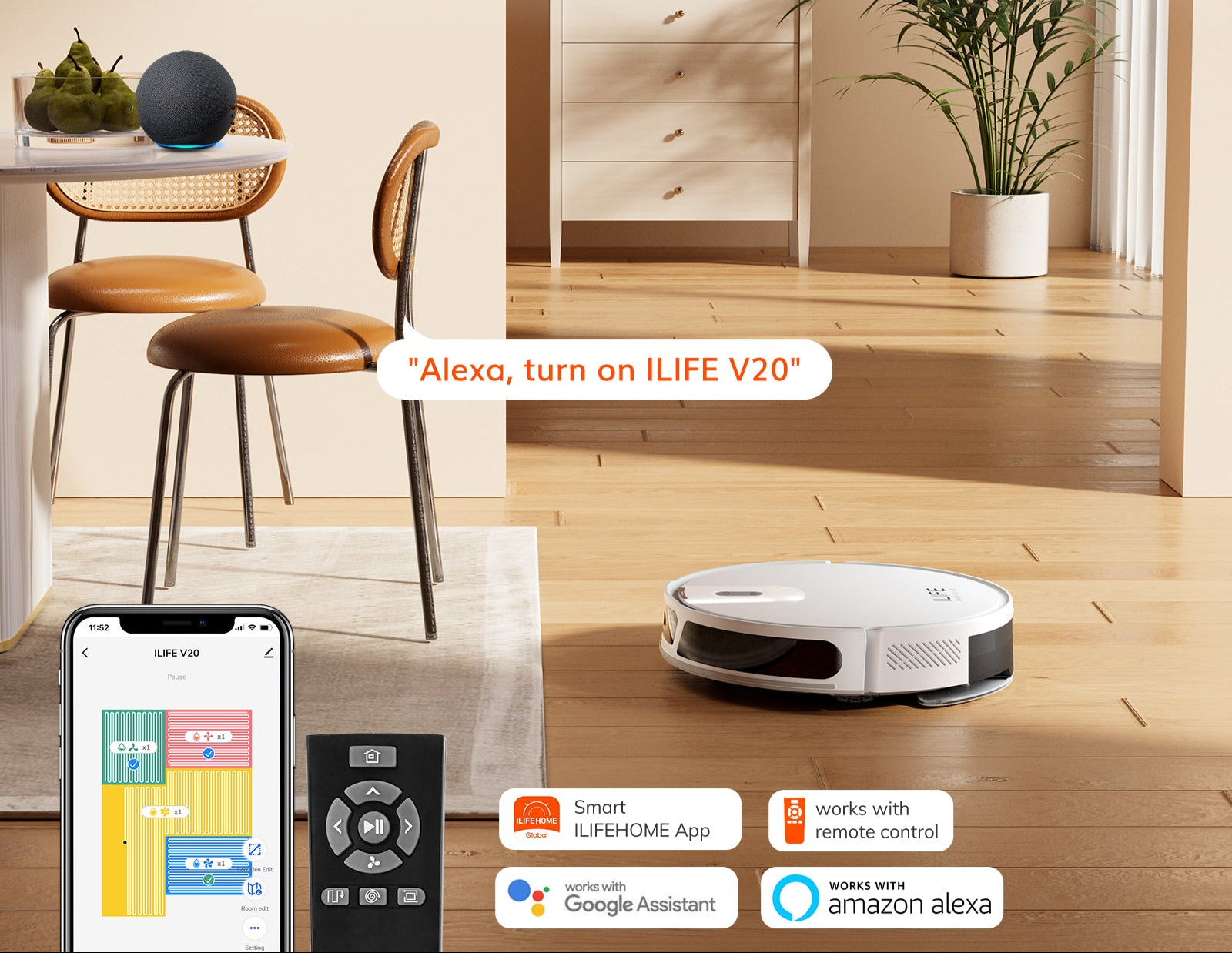 V20 vacuum allows effortless operation through multiple control options. With the Smart App, you can schedule cleanings, monitor progress, and customise settings. It is also compatible with voice assistants like Google Home and Alexa, ensuring hands-free commands. In addition, a remote control is included for smooth manual operation, making it a versatile and convenient choice for all users.