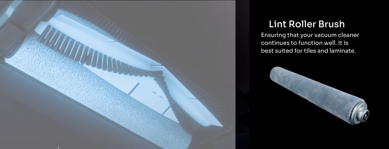 The X1000 Lint roller brush is responsible for agitating and lifting dirt, dust, and debris from various floor surfaces such as carpets, rugs, and hard floors.