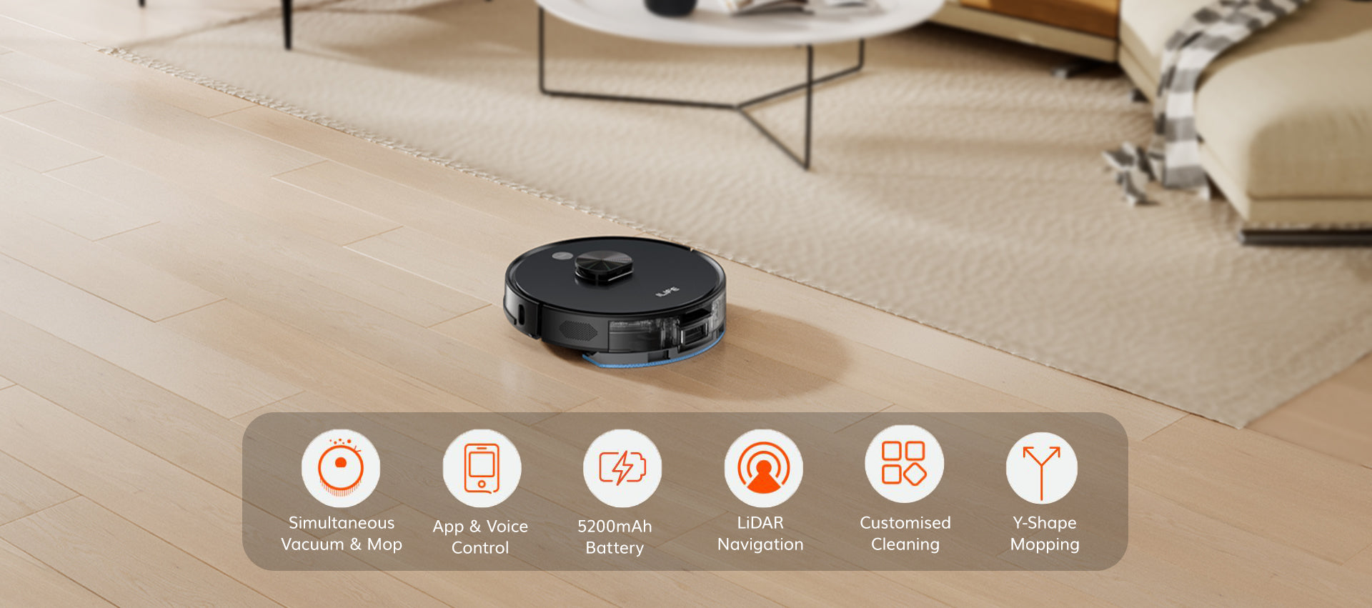 ILIFE T60s Robotic Vacuum Cleaner is a smart, all-in-one cleaning solution powered by AI and LiDAR for precise navigation. This vacuum and mop combo features strong suction, auto mop lift, and a self-emptying dustbin for hands-free cleaning. With self-washing, hot air drying, and a smart mopping system that mimics human movements, it ensures deep, efficient cleaning. Its extendable, liftable mop reaches tight and elevated areas, making it a truly self-sufficient, low-maintenance device