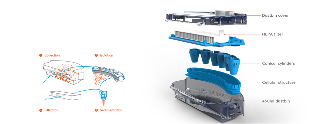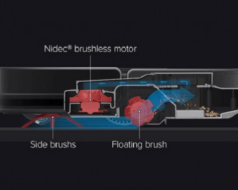 It has an advanced cleaning system that cleans your home in 3 steps: specially tailored side brushes sweep debris to the cleaning path where the roller brush at the bottom of the robot removes dust, and strong suction and a large dustbin ensure maximum debris pickups.