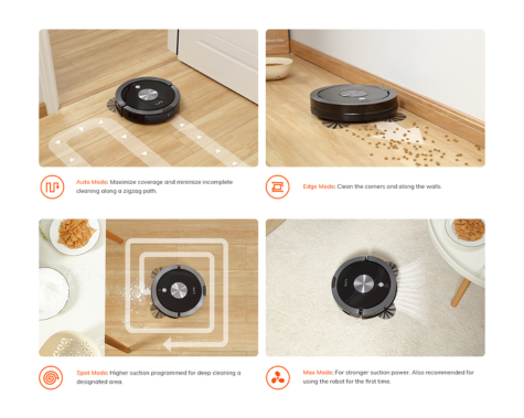 Auto Mode: Follows a methodical path, ensuring a systematic and thorough cleaning routine. - Spot Mode: Concentrated cleaning for larger areas with heavy debris. - Edge Mode: Target corners and borders with precision. - Max Mode: Provides extra suction power for smaller regions with stubborn, set-in dust.